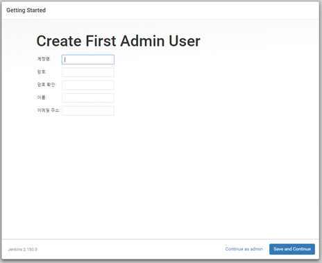 /var/lib/jenkins/secrets/initialAdminPassword 해당 파일에 관리자 키 값이 있으며 해당 키 값을 아래화면에 입력 후 ‘Continue’ 클릭