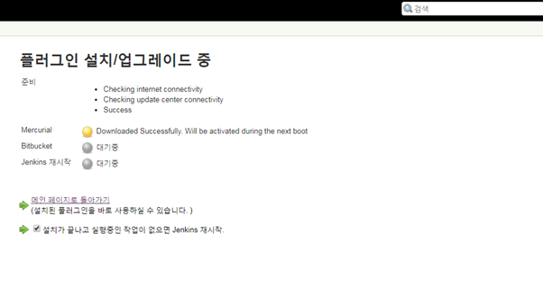 2) Bitbucket 체크 후 설치 , 설치가 끝나고 실행중인 작업이 없으면 Jenkins 재시작 체크