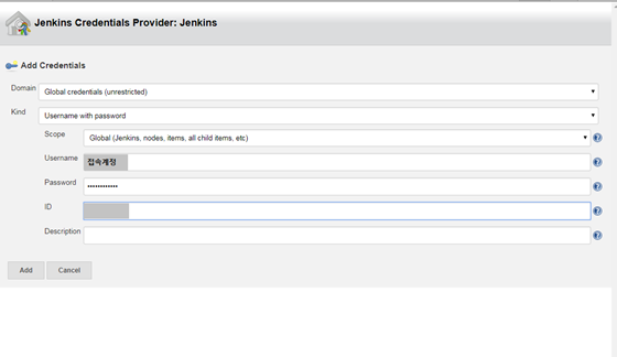 - Credentials 부분에 [Add] 버튼을 클릭하여 접속계정을 추가한다.