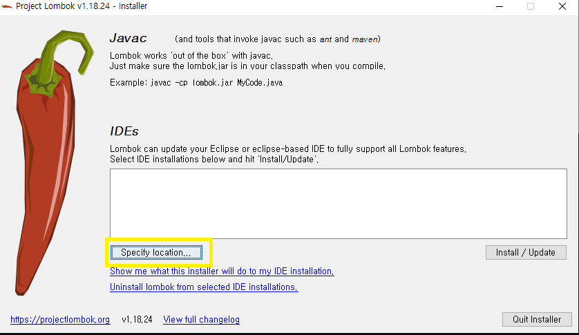 1. 공식 사이트(https://projectlombok.org/download)에서 jar파일을 다운 받는다 2. 이클립스 혹은 STS 다운& 설치된 폴더로 이동한다. 3. 이클립스 혹은 STS 실행 파일이 있는 폴더에 lombok.jar 파일을 저장 한다 4. 명령 프롬프트 관리자 모드로 실행 후 jdk 설치된 폴더로 이동한다 # 예제 # JDK 설치 위치로 이동 > cd C:\Java\jdk1.8\bin # Lombok 실행 # java -jar [ 이클립스 혹은 STS 실행파일내 lombok 경로 ]\lombok.jar > java -jar D:\util\sts-4.16.0.RELEASE\lombok.jar 5. java -jar [ 이클립스 혹은 STS 실행파일내 lombok 경로 ]\lombo..