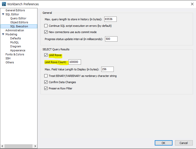 workbench 데이터 수 제한 workbench 실행 -> Edit -> Preferences -> SQL Editor -> SQL Execution : Limit Rows Count (제한 수 지정) workbench 실행 -> Edit -> Preferences -> SQL Editor -> SQL Execution : Limit Rows (체크를 풀면 전체 Rows 모두 보여집니다.) Mysql/mysql Workbench 2021.04.26