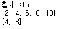 my_list = [1,2,3,4,5] #list my_sum = 0 for tmp in range(len(my_list)): # :(인덴트)를 이용 my_sum += my_list[tmp] print("합계 :{}" .format(my_sum)) my_list = [1,2,3,4,5] #list new_list =[tmp * 2 for tmp in my_list] print(new_list) my_list = [1,2,3,4,5] #list new_list =[tmp * 2 for tmp in my_list if tmp % 2 == 0] print(new_list)