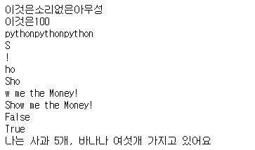 # 주석 #한 줄 주석 """ 여러줄 주석 """ # 내장 상수 True, False, None(값이 존재하지 않음을 의미) 대소문자 구분함 a=True b=False c=None #데이터 타입 명시하지 않음 # 출력 for tmp in range(10): #0~9 print("tmp:{}".format(tmp), end=",") #print함수는 기본적으로 출력한다음 한줄을 넘김 #print함수의 마지막 인자로 출력에 대한 제어 가능 # built-in data type & Variable - Numeric - Sequence - Text Sequence - Set - Mapping - Class # built-in data type : Numeric type(숫자형) - int (정수) - float..